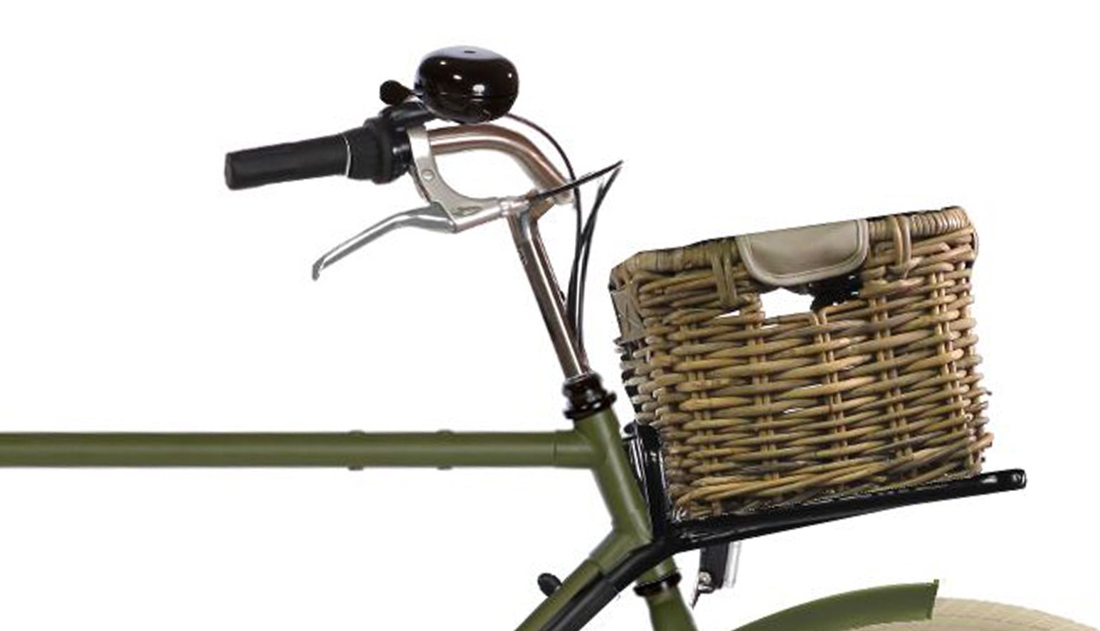 Cette malle élégante en rotin naturel se fixe au porte-bagage avant des vélos hollandais.