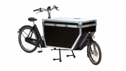 Cette version du biporteur livreur Bakfiets Flightcase est équipée d'un moteur pédalier EP6 délivrant un couple maximal de 85 Nm et alimenté par une batterie de capacité 504 Wh (36V 14 Ah).